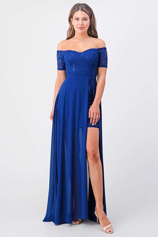Glamorous off-shoulder dress with sequin lace overlay, chiffon skirt, and high thigh front slit. Perfect for parties, proms, or special nights out.