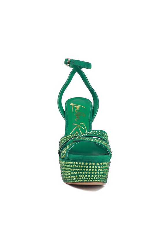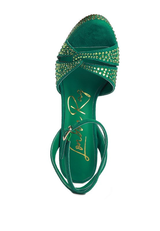 Expertly crafted from high-quality microfiber material, these studded sandals feature a soft padded insole and heatset diamante detailing for ultimate comfort and style. The open pointed toe and high heeled block design provide a chic and sophisticated look. Complete with a pin buckle ankle strap fastening and durable rubber outer sole.
