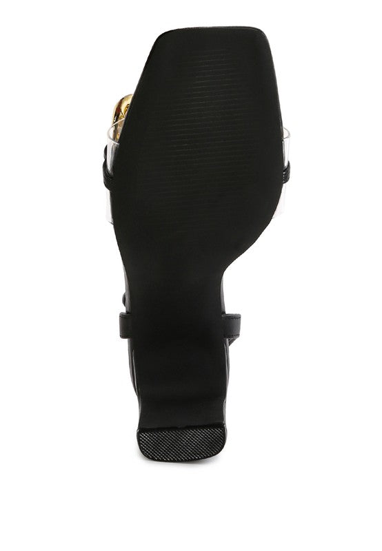 PU+PVC block heel sandals with chunky metal chain detail, cushioned insole & pin buckle fastening. Perfect for chic casual looks.