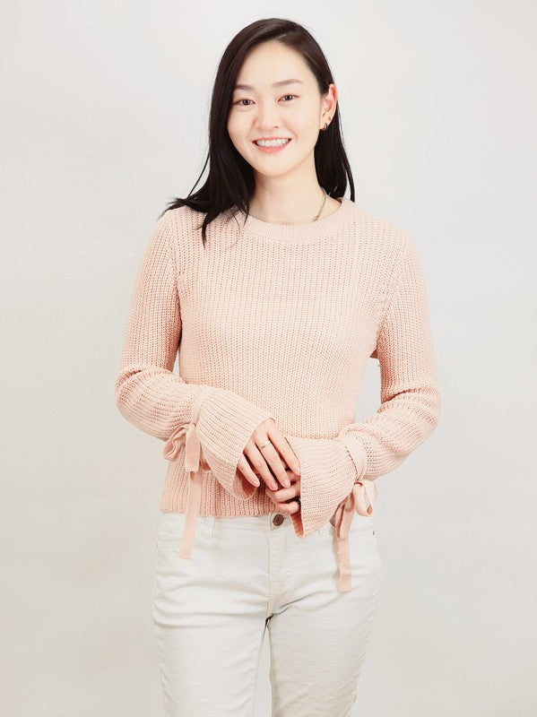 Cute waffle knit pullover with bow-tied bell sleeves and 20–21" length. Lightweight, soft acrylic/polyester yarn with stretch for cozy comfort.