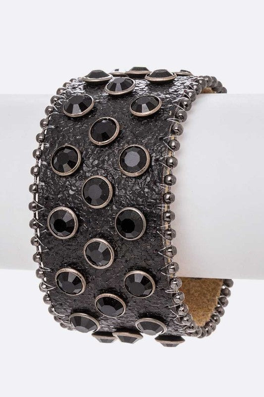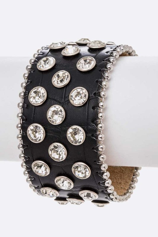 Enhance your style with the impressive Crystal Studs Croc Embossed Leather Cuff. Featuring a bold and textured croc-embossed design, this leather cuff is adorned with sparkling crystal studs for a touch of glamour. Elevate any outfit and make a statement with this unique and luxurious accessory.