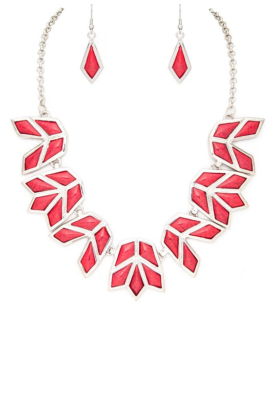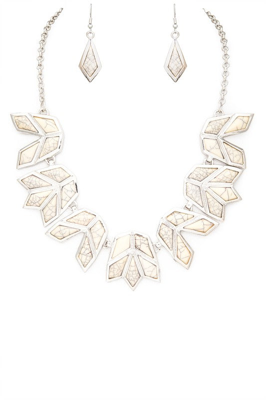 This Cutout Stone Pattern Statement Necklace Set is a must-have accessory for any fashion-forward individual. Crafted with precision and adorned with intricate cutout patterns and stunning gemstones, this set will elevate any outfit and make a statement. Enhance your style with this unique and elegant necklace set.