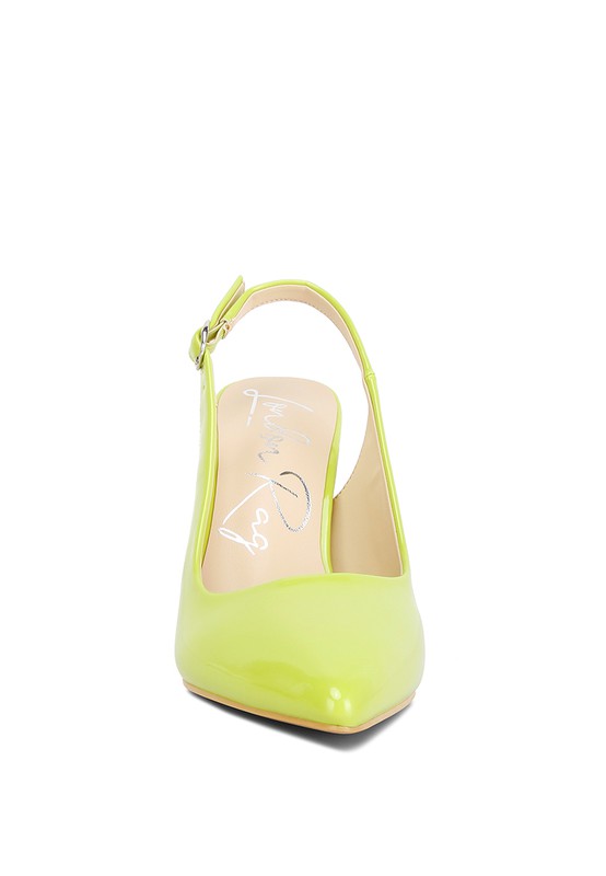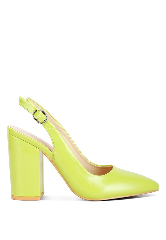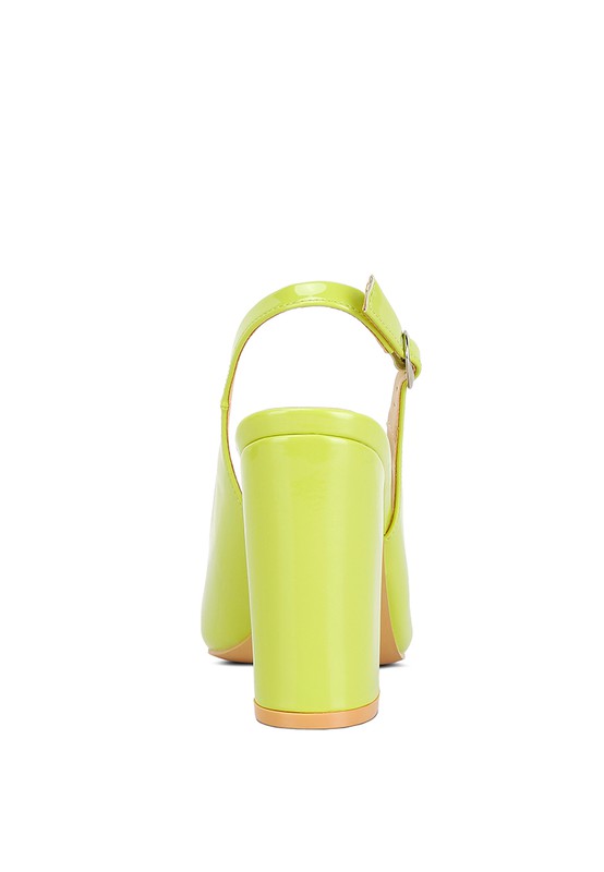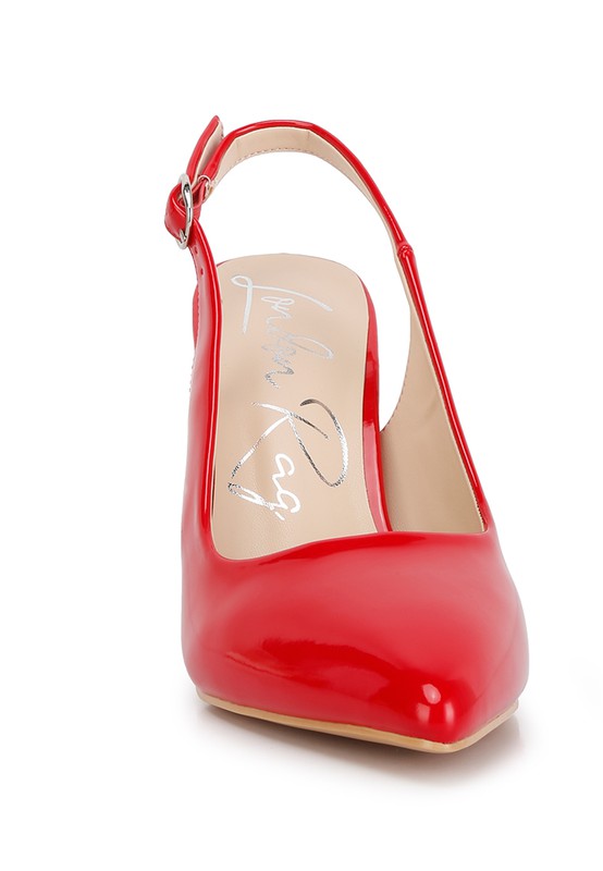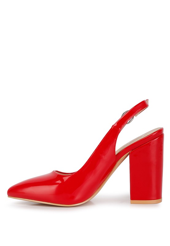 Shop women’s patent faux leather block heel sandals with closed pointed toe, high heel, and buckle closure. Features cushioned insole and sleek, polished look.