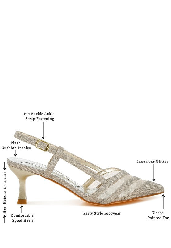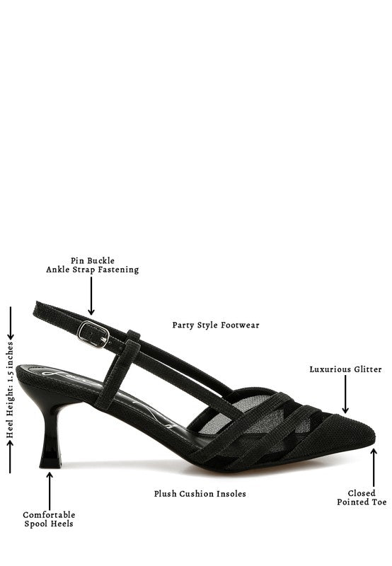 The Kitten Heel Slingback Pumps are elegant dress sandals with tapered heels and an adjustable slingback strap for a secure fit. Made with glitter fabric and a rubber sole, these pumps also feature a closed pointed toe and a pin buckle fastening for added style. With comfortable cushion insoles, these pumps are perfect for any occasion.