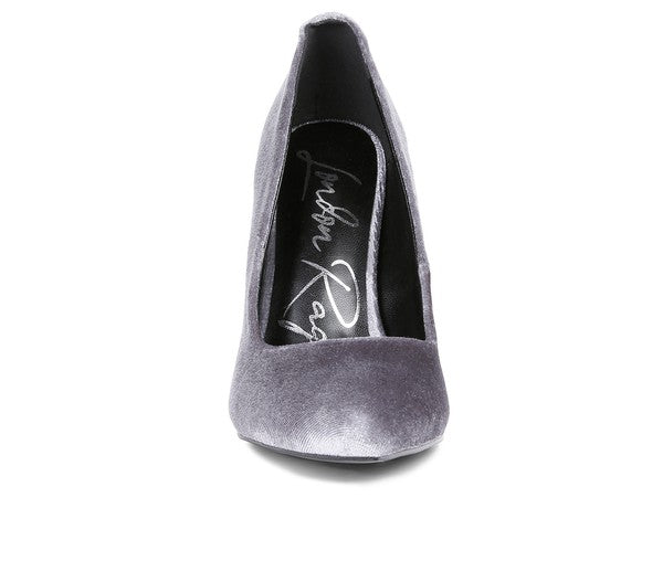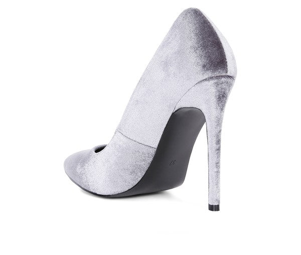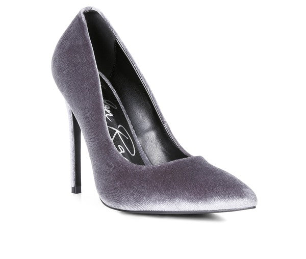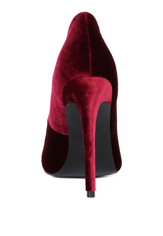 Elegant velvet stiletto pumps with closed pointed toe and cushioned insoles. Slip-on design for effortless style, perfect for dressy occasions.
