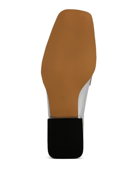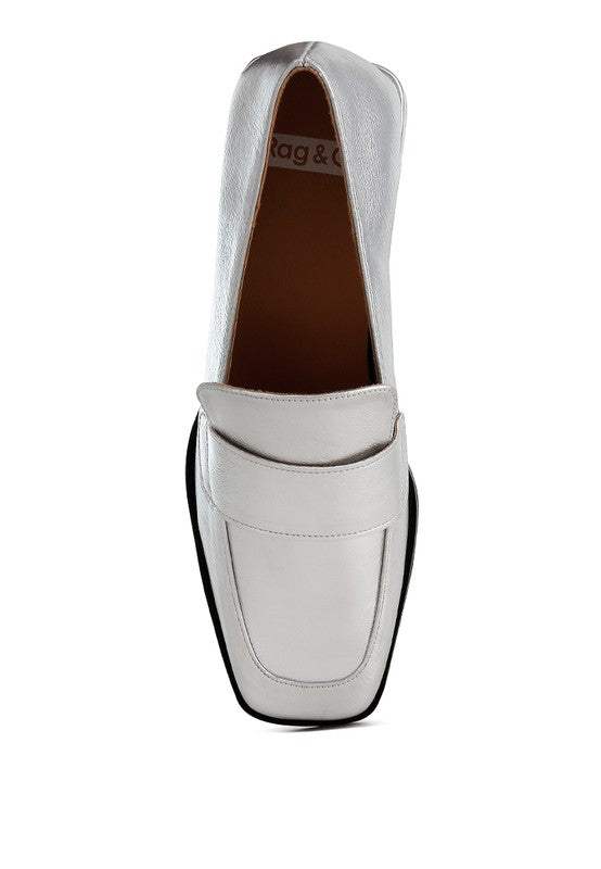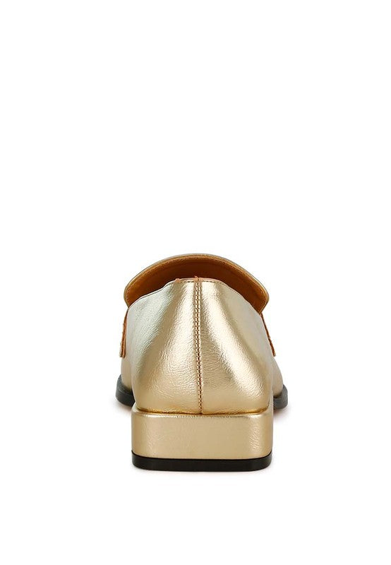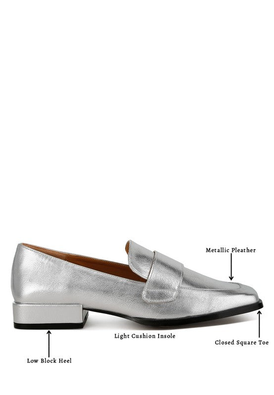 Expertly crafted with a closed square toe and low block heel, these Metallic Penny Loafers offer a comfortable and stylish option for any occasion. Made from crinkled metallic pleather and a rubber outer sole, these loafers also feature a convenient slip on closure and strap detail.