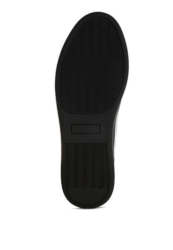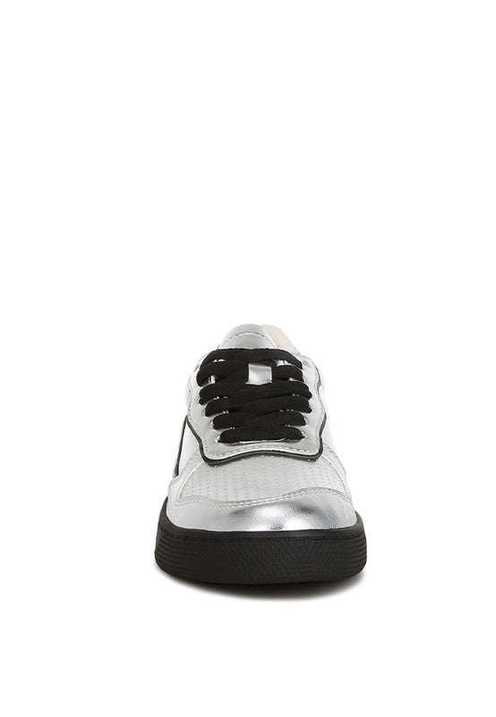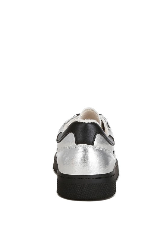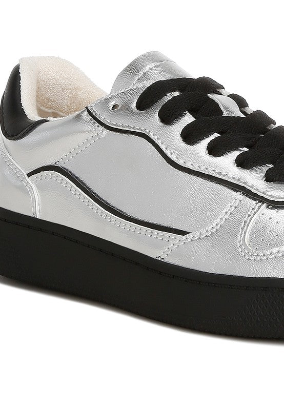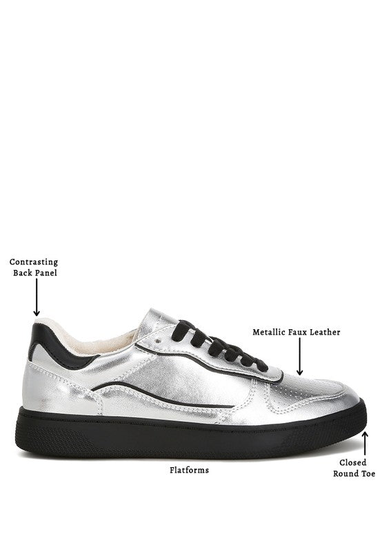 Introducing our Metallic Everyday Sneakers, crafted with a durable TPR sole and a comfortable cushion insole. The contrasting back panel adds a touch of style to these lace-up sneakers, featuring a closed round toe and flat heels. Perfect for any casual outing with its metallic faux leather upper material.