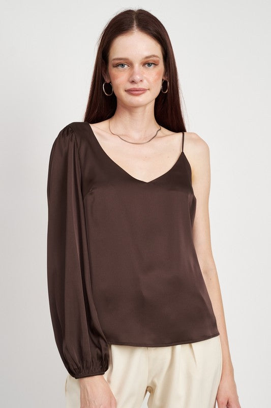 Chic one-shoulder blouse with delicate spaghetti strap and long sleeve. Lightweight and stylish, perfect for casual outings or dressy occasions.