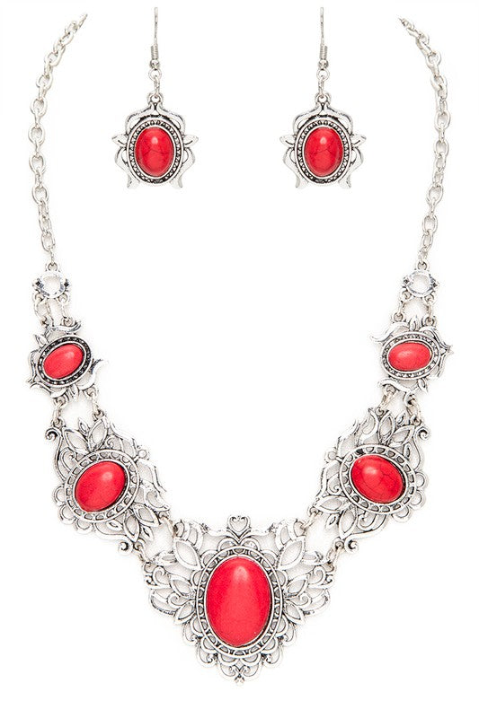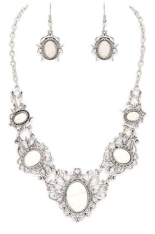 This Oval Stone Bib Necklace Set is a beautiful addition to any outfit. The 18" necklace comes with an extension for added versatility. The matching 2" drop earrings are set in silver-toned mixed metal, giving them a sleek and modern look. The lobster clasp closure ensures a secure fit.
