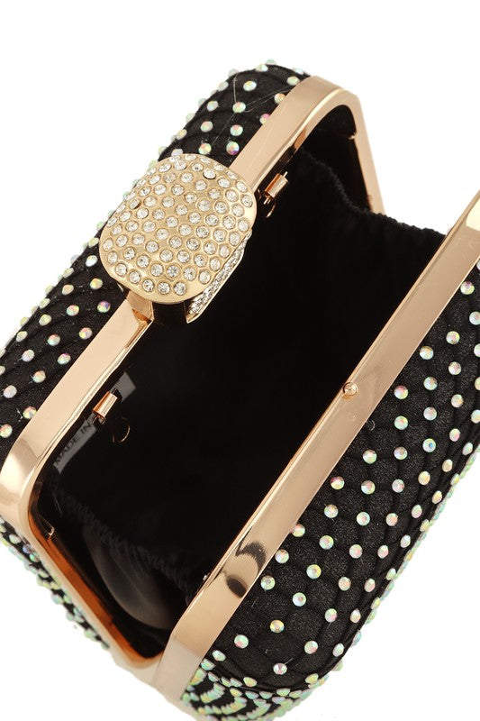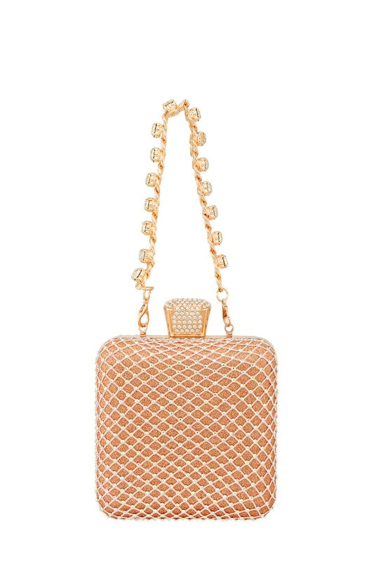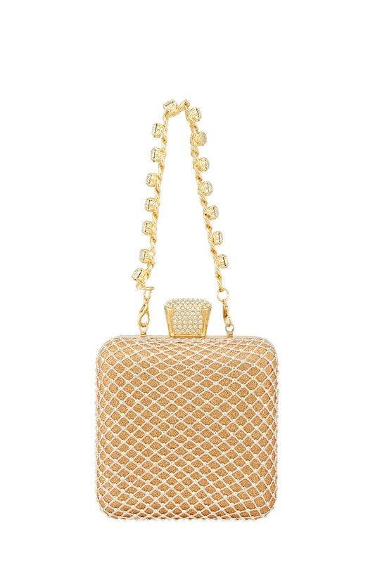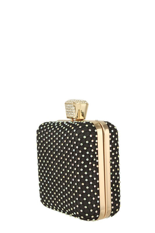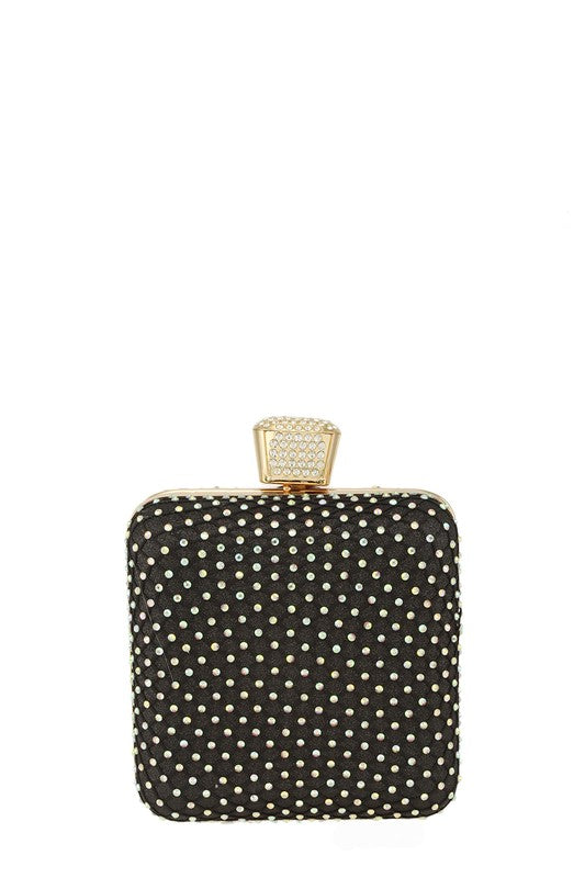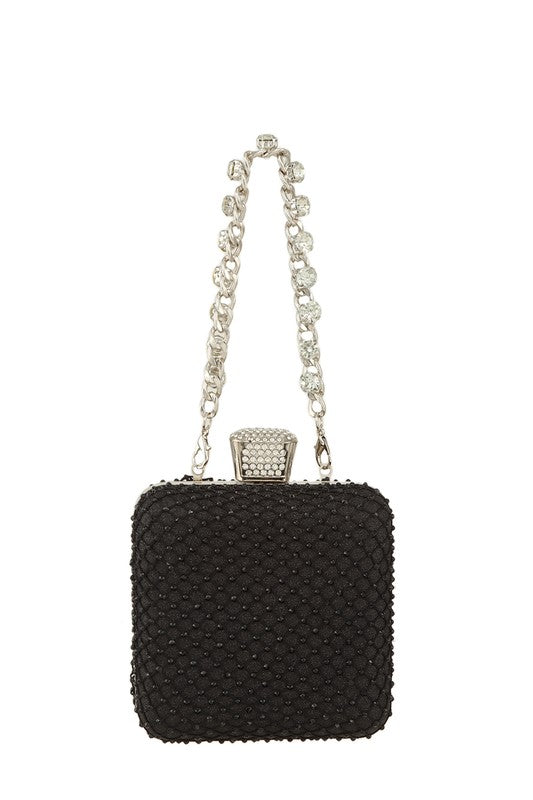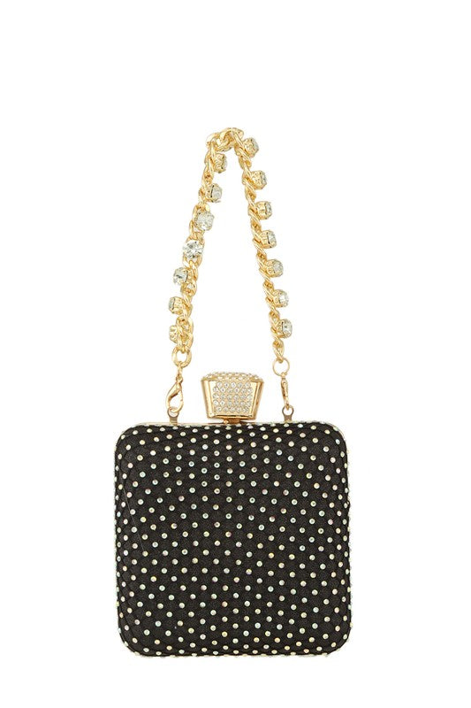 Introducing the Rhinestone Paved Box Bag for the perfect blend of elegance and functionality. Featuring a square shape and a removable rhinestone handle, this bag also has a lift lock closure for added security. Measuring 5"(L) x 2.5"(W) x 5"(H), it's the ideal size for all your essentials.