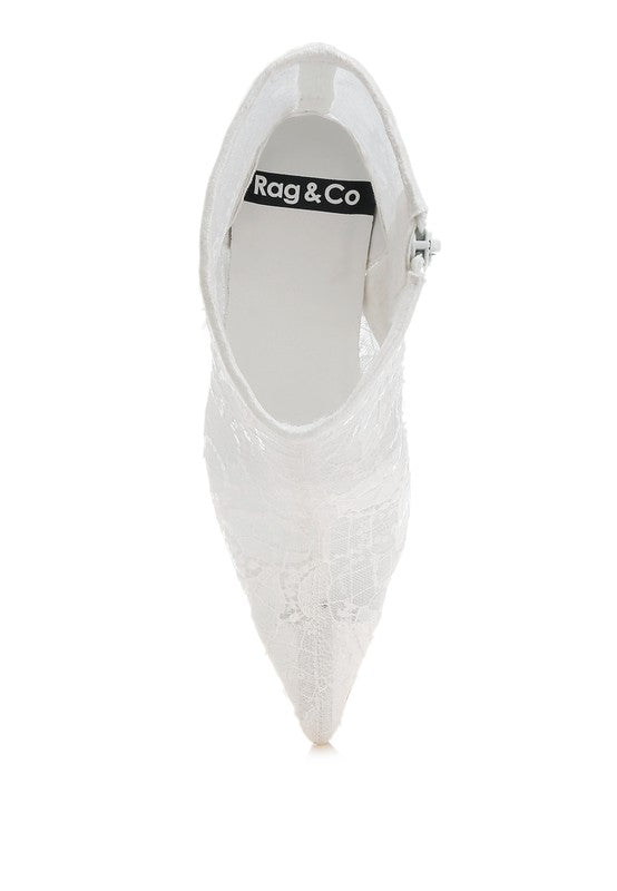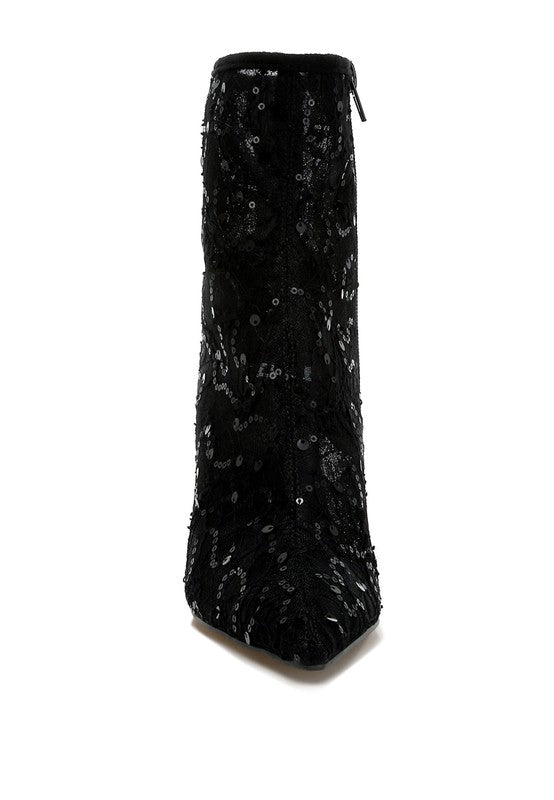 These elegant Sequin Lace Ankle Boots feature a closed pointed toe, spool heels, and sequins and sheer detailing for a touch of glamour. The comfortable cushion insole and zipper closure provide both beauty and comfort. Made with lace upper and rubber outer sole, perfect for any occasion.
