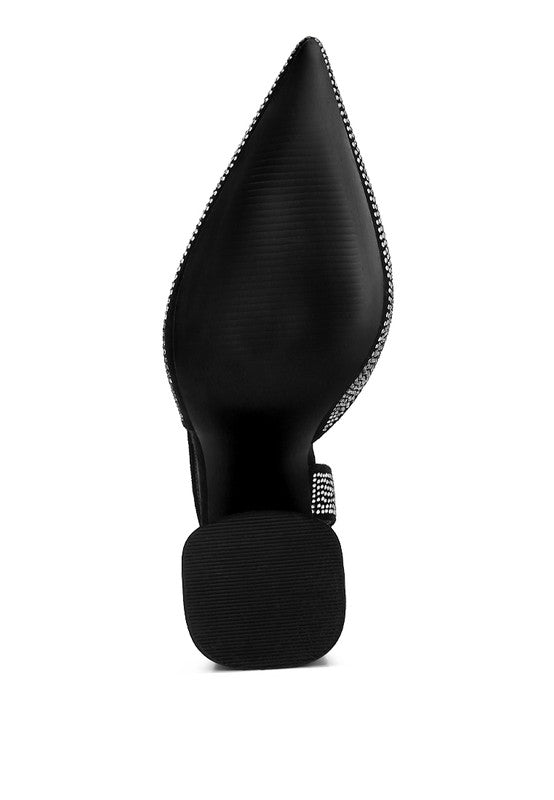 Elevate your style with our Rhinestone Suede Heel Sandals. Crafted from recycled micro suede, these sandals feature a closed pointed toe and slingback strap for a secure fit. The light cushion insoles provide comfort, while the flared heel and rhinestone embellishment add a touch of glamour.