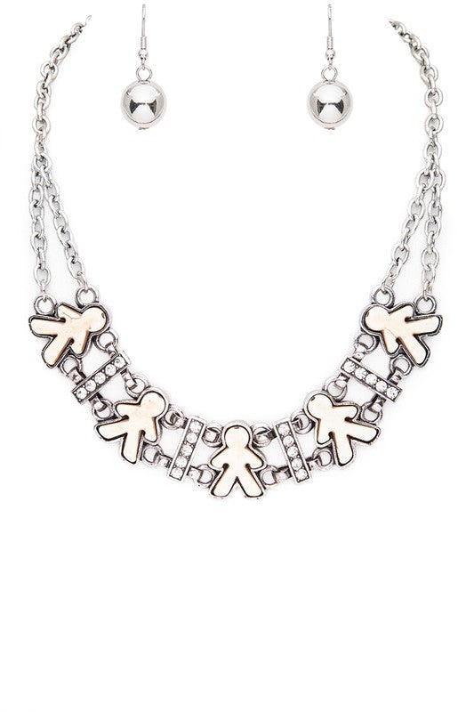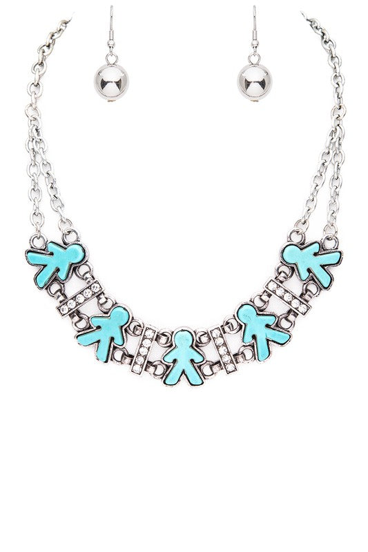 Elevate your look with our Stone Little People Statement Collar Necklace Set. Crafted with stunning stones, this necklace adds a touch of elegance to any outfit. With a bold and eye-catching design, it makes a statement that is sure to turn heads. Perfect for any occasion, this set is a must-have for your jewelry collection.