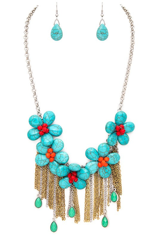 This elegant Turquoise Flower Fringe Chain Necklace Set adds a touch of sophistication to any outfit. With its unique design and beautiful turquoise flowers, it is a must-have for any jewelry collection. Made with high-quality materials, it is durable and versatile, perfect for any occasion. Elevate your style with this stunning necklace set.