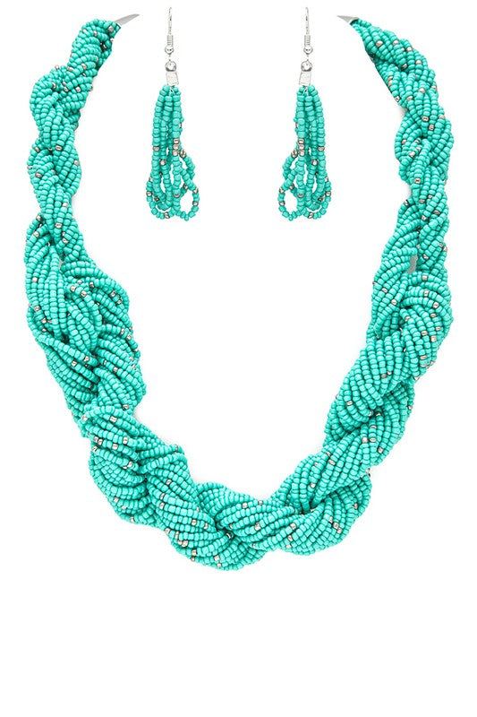 This versatile Seed Bead Statement Necklace Set features a 20" necklace with an extension for a customizable fit, and elegant 2.85" drop earrings. The twisted design adds an eye-catching element, while the lobster clasp closure ensures secure wear. Perfect for adding a touch of sophistication to any outfit.