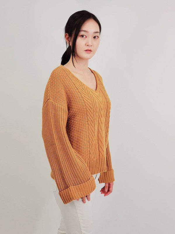 Cozy oversized V-neck sweater with cable knit body, waffle-textured wide bell sleeves, and 22–23" length. Soft acrylic for warmth and comfort.