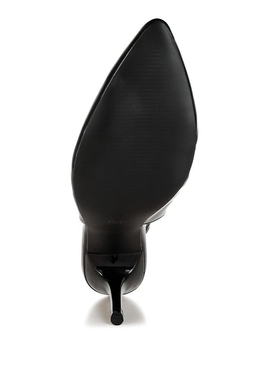 Elevate your style with our Slingback Loafer Sandals. Made with high-quality patent pleather, these sandals feature a pointed toe and stiletto heel for a sleek and sophisticated look. The strap detail on the vamp and slingback fastening add an elegant touch, while the elasticated gussets and cushion insoles provide comfort for all-day wear.